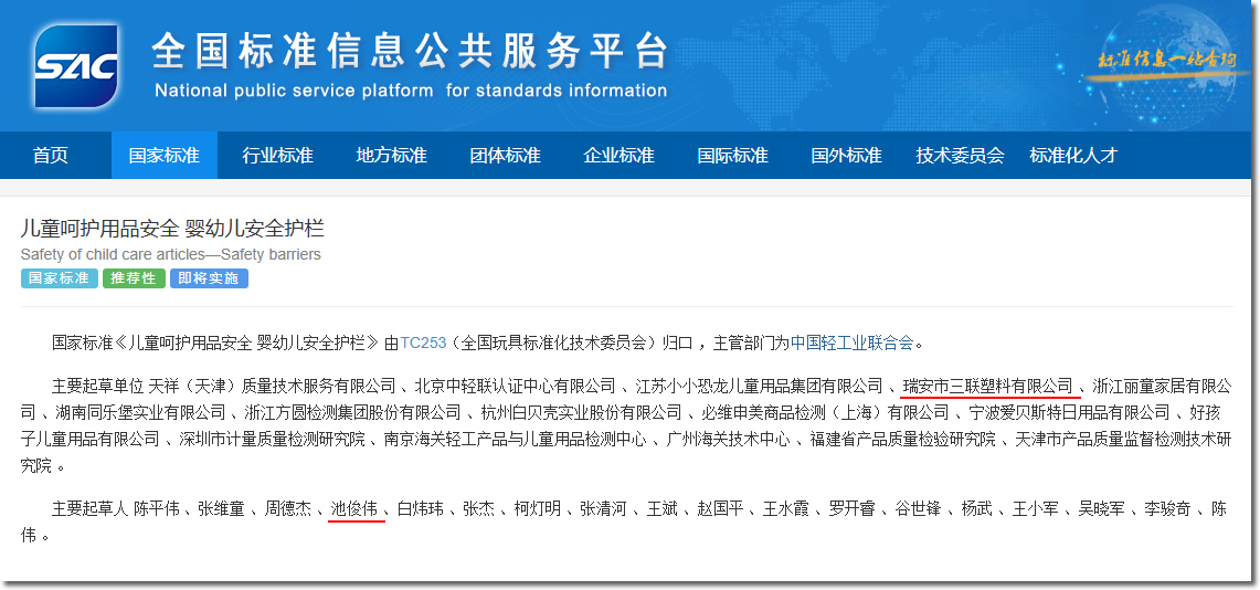 近日,国家市场监督管理总局、国家标准化管理委员会发布中华人民共和国国家标准公告(2025年第24号),由瑞安市三联塑料有限公司作为主要起草单位、公司产品经理池俊伟担任起草人的国家标准《儿童呵护用品安全 婴幼儿安全护栏》(GB/T 46508-2025)正式获批发布,并将于 2026年11月1日起全面实施。这一标准的出台,不仅填补了当前婴幼儿围栏类目缺乏统一国家标准的行业空白,更为我国婴幼儿用品安全领域树立了全新质量标杆,同时也是公司在标准化建设与高质量发展道路上取得的又一重要成果,标志着公司在以标准引领产品升级、以质量赋能产业转型的进程中迈出了关键一步。